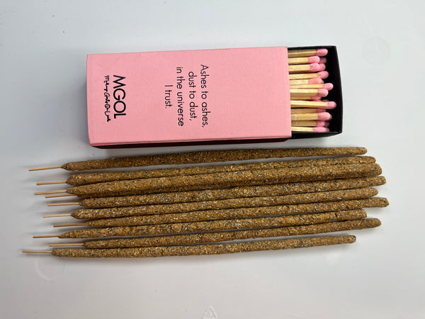 These are top quality made, slow burning and made from real herbs. A great alternative for burning Palo Santo wood sticks. These palo santo incense sticks are more practical, they burn on their own, you will not have to keep relighting them like the wood sticks. We have 6 options to choose from that are mixed with Palo Santo you can choose from. All our incense come in a ten pack plus a box of our MGOL signature match box. Light it up. 15 sticks with one box of matches